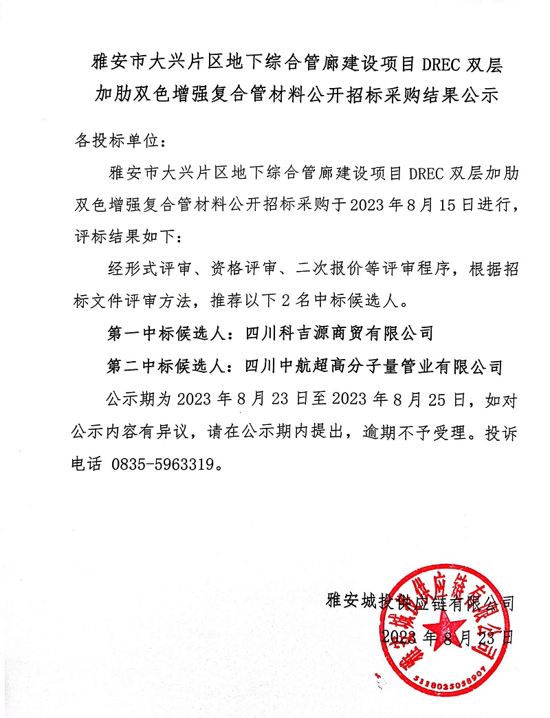 雅安市大興片區(qū)地下綜合管廊建設(shè)項目DREC雙層加肋雙色增強復(fù)合管材料公開招標(biāo)采購結(jié)果公示