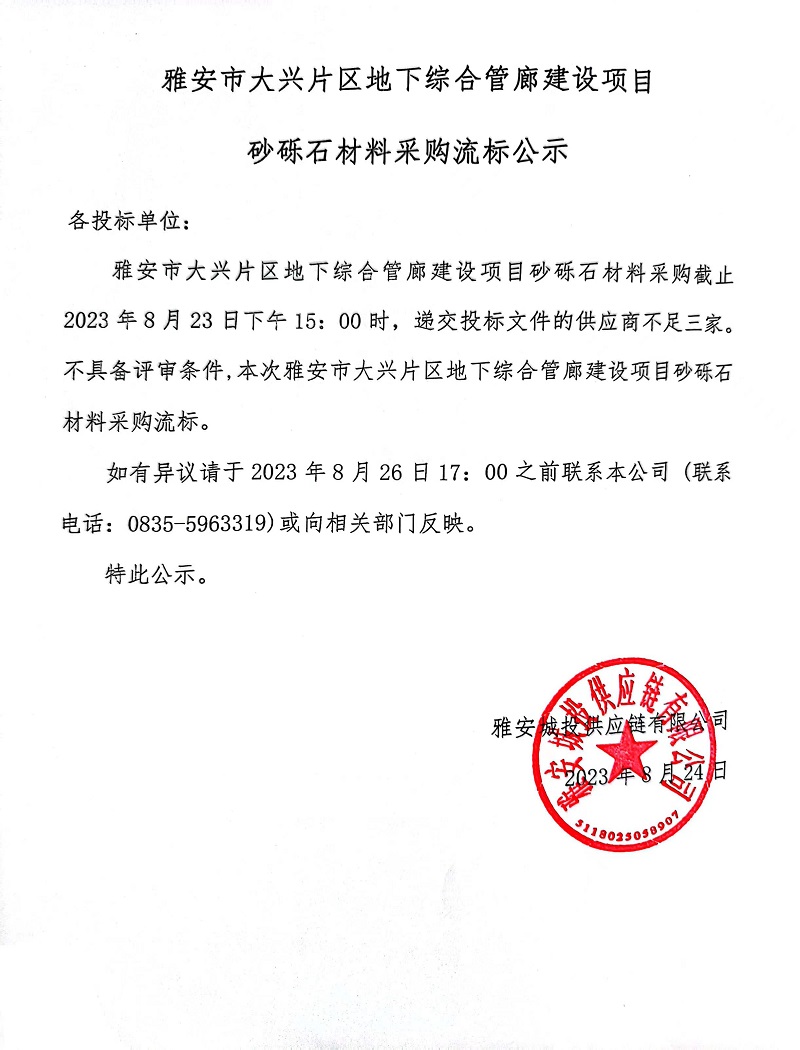 雅安市大興片區(qū)地下綜合管廊建設(shè)項(xiàng)目砂礫材料采購流標(biāo)公示