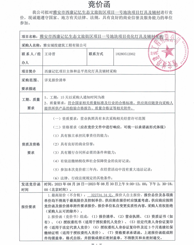 雅安市西康記憶生態(tài)文旅街區(qū)項(xiàng)目一號地塊項(xiàng)目燈具及輔材競價采購公告