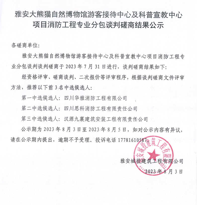 雅安大熊貓自然博物館游客接待中心及科普宣教中心項目消防工程專業(yè)分包談判磋商結果公示