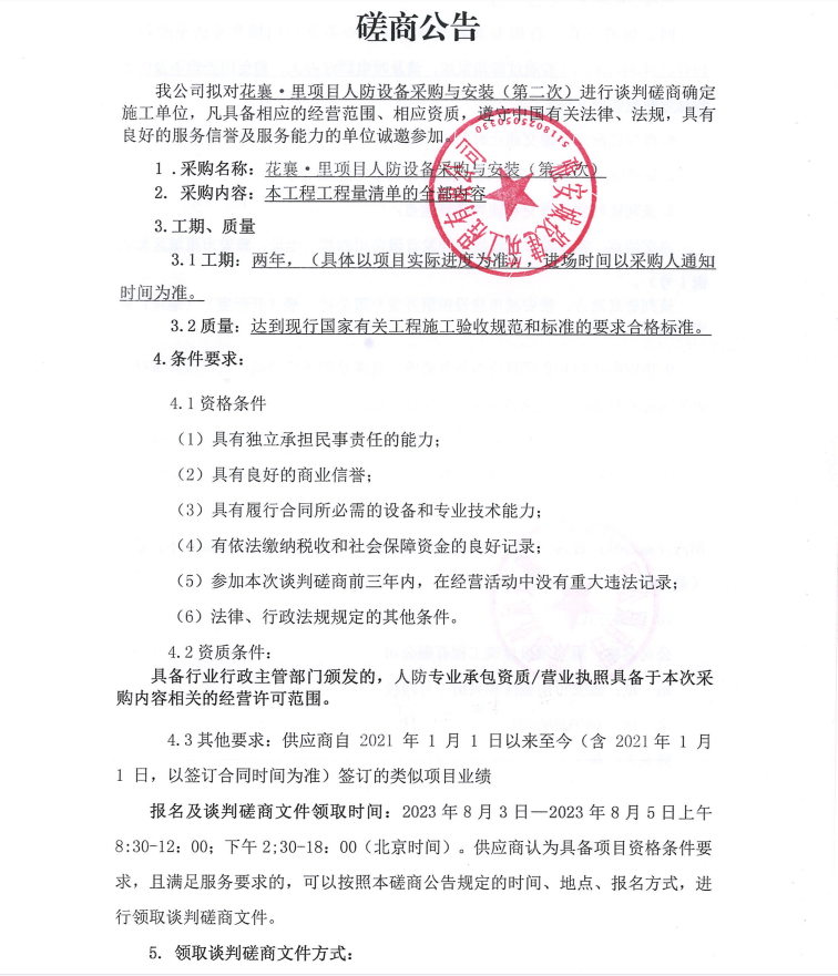 花襄·里項目人防設(shè)備采購與安裝(第二次)談判磋商公告