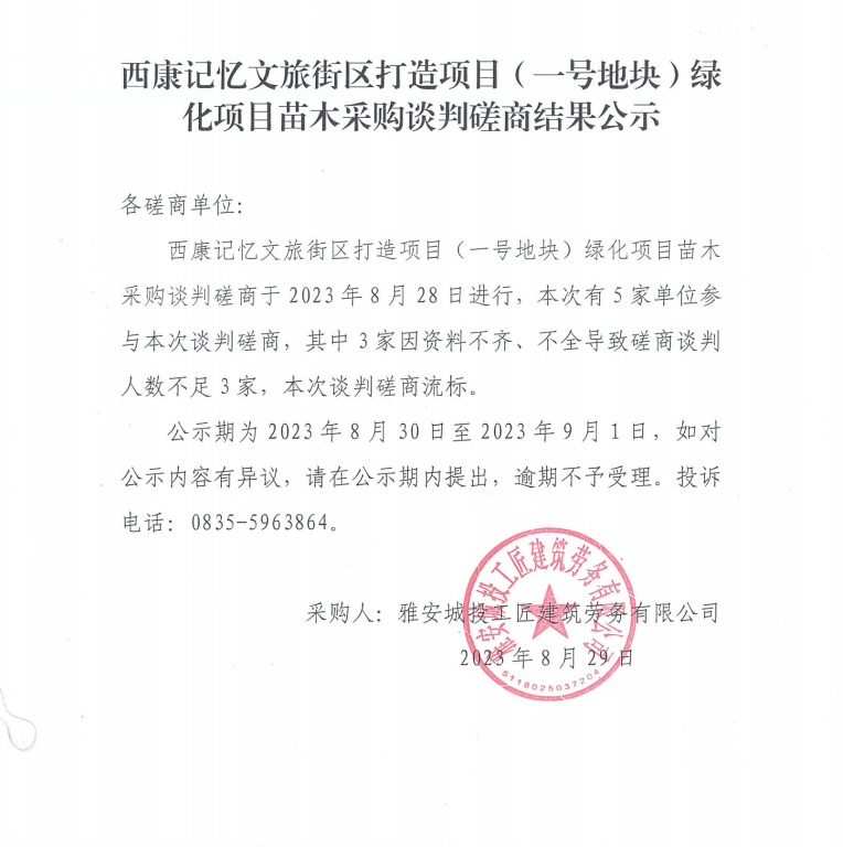 西康記憶文旅街區(qū)打造項目(一號地塊)綠化項目苗木采購談判磋商結(jié)果公示