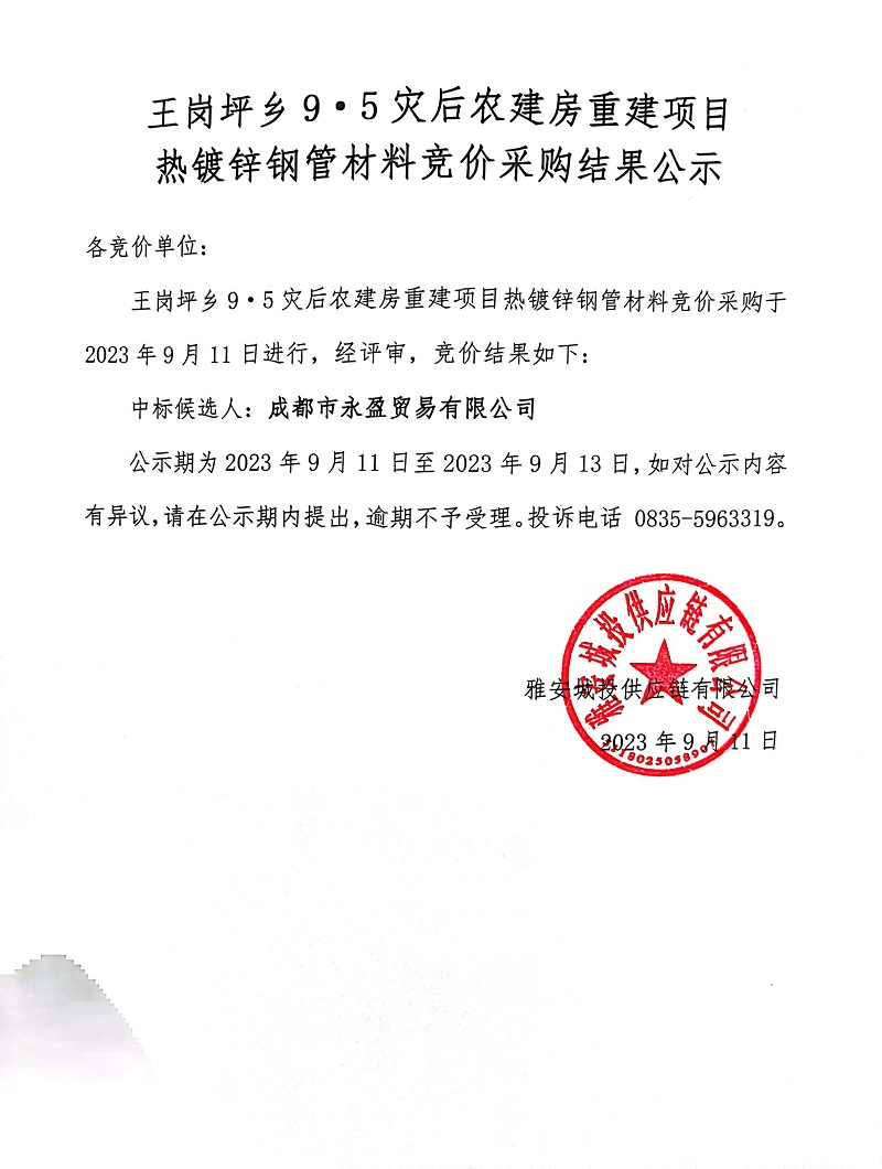 王崗坪鄉(xiāng)9.5災后農建房重建項目熱鍍鋅鋼管材料競價采購結果公示
