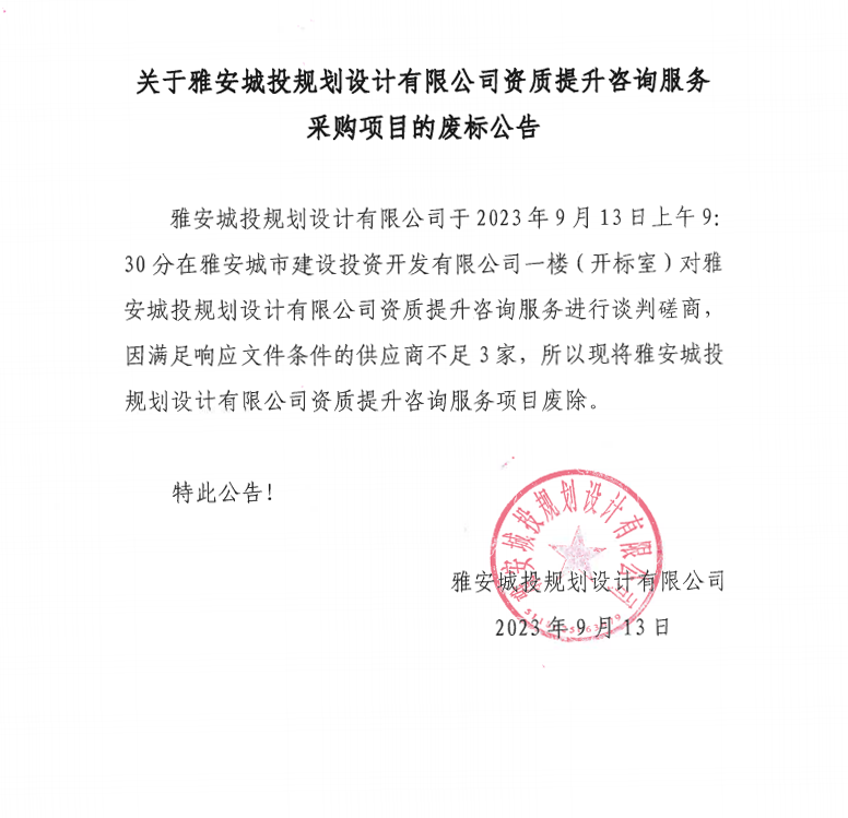 關(guān)于雅安城投規(guī)劃設(shè)計(jì)有限公司資質(zhì)提升咨詢(xún)服務(wù)采購(gòu)項(xiàng)目的廢標(biāo)公告