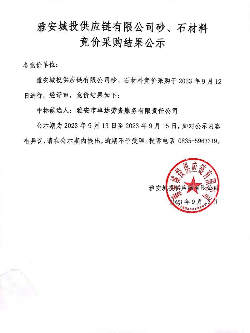 雅安城投供應鏈有限公司砂、石材料競價采購結果公示
