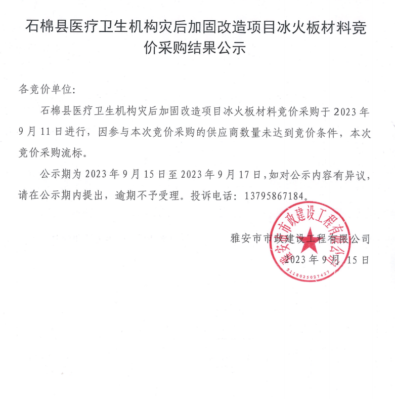 石棉縣醫(yī)療衛(wèi)生機構災后加固改造項目冰火板材料競價采購結果公示