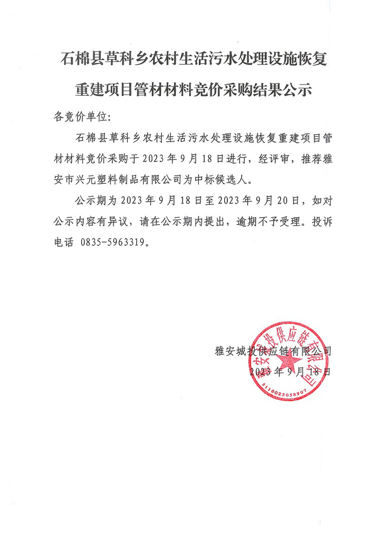 石棉縣草科鄉(xiāng)農(nóng)村生活污水處理設(shè)施恢復(fù)重建項(xiàng)目管材材料競價采購結(jié)果公示