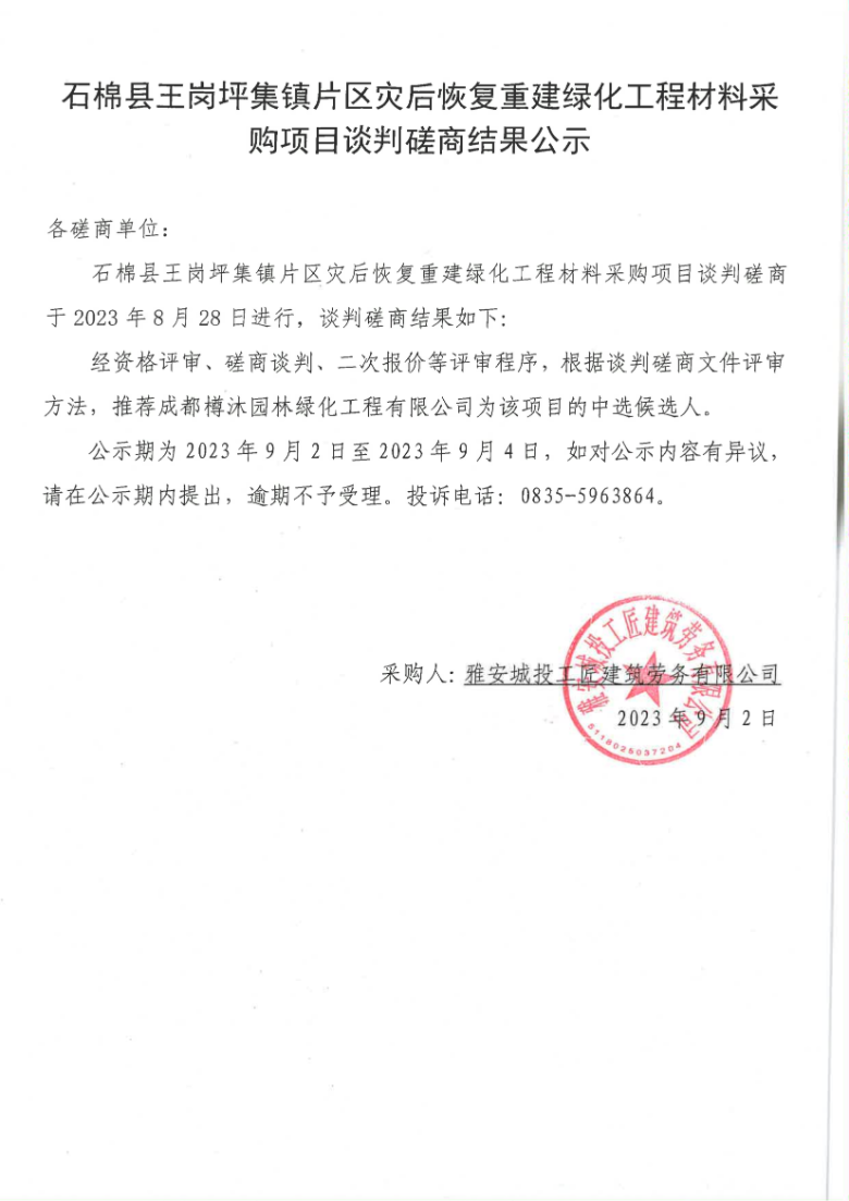 石棉縣王崗坪集鎮(zhèn)片區(qū)災后恢復重建綠化工程材料采購項目談判磋商結(jié)果公示