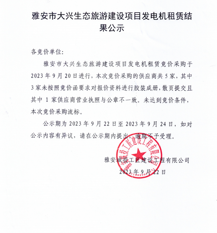 雅安市大興生態(tài)旅游建設項目發(fā)電機租賃結果公示