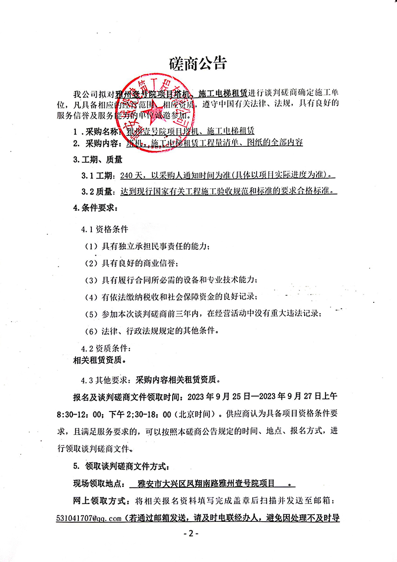 雅州壹號項(xiàng)目塔機(jī)、施工電梯租賃磋商公告