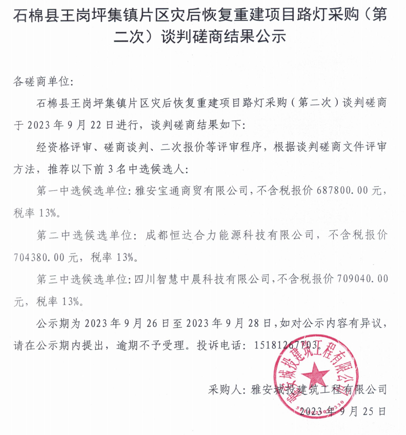 石棉縣王崗坪集鎮(zhèn)片區(qū)災(zāi)后恢復(fù)重建項目路燈采購(第二次)談判磋商結(jié)果公示