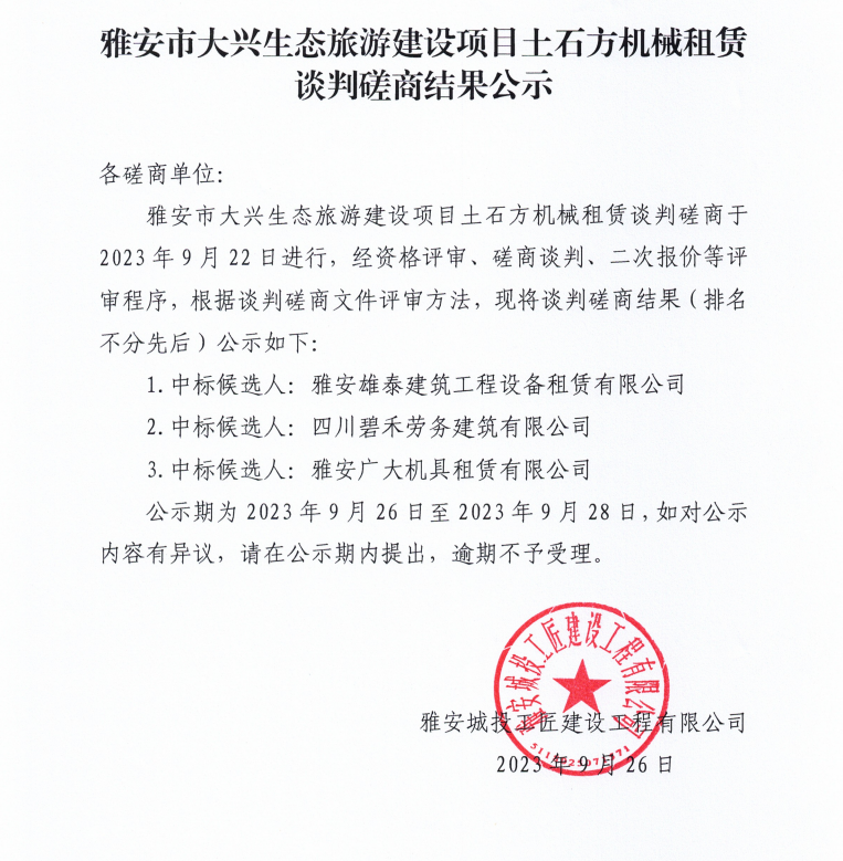 雅安市大興生態(tài)旅游建設(shè)項(xiàng)目土石方機(jī)械租賃談判磋商結(jié)果公示