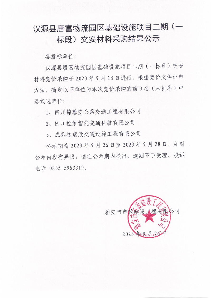 漢源縣唐富物流園區(qū)基礎(chǔ)設(shè)施項目二期(一標(biāo)段)交安材料采購結(jié)果公示