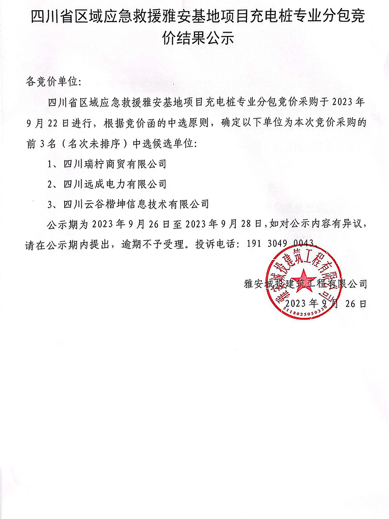 四川省區(qū)域應(yīng)急救援雅安基地項(xiàng)目充電樁專(zhuān)業(yè)分包競(jìng)價(jià)結(jié)果公示