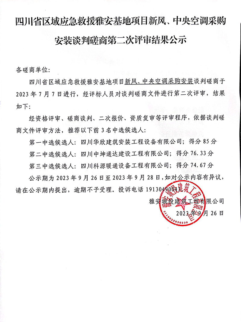 四川省區(qū)域應急救援雅安基地項目新風、中央空調(diào)采購安裝談判磋商第二次評審結(jié)果公示