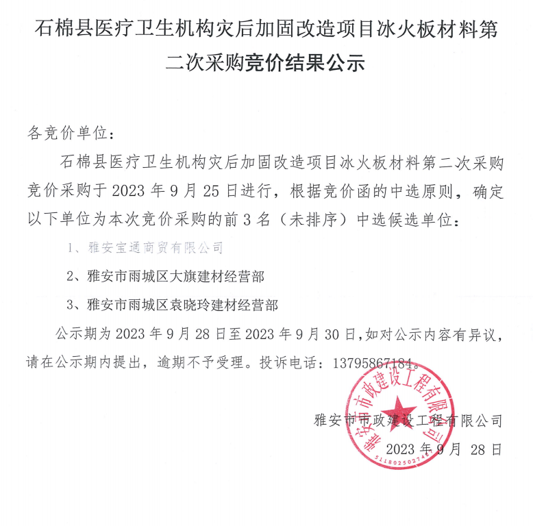 石棉縣醫(yī)療衛(wèi)生機構災后加固改造項目冰火板材料第二次采購競價結果公示