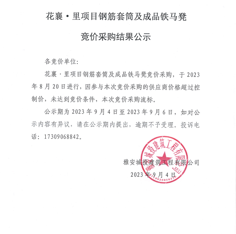 花襄·里鋼筋套筒及成品鐵馬凳競價采購結(jié)果公示
