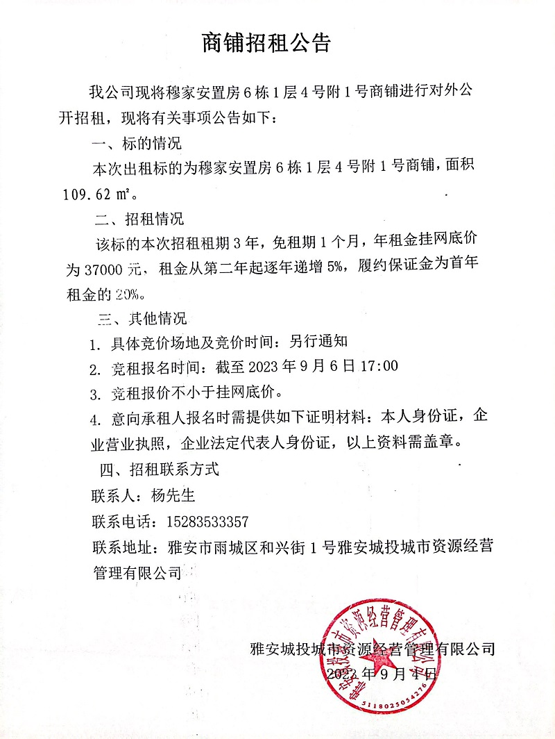 穆家安置房6棟1層4號(hào)附1號(hào)商鋪招租公告