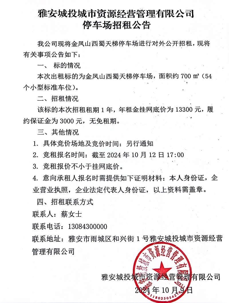 雅安城投城市資源經(jīng)營(yíng)管理有限公司關(guān)于金鳳山西蜀天梯停車場(chǎng)招租的公告