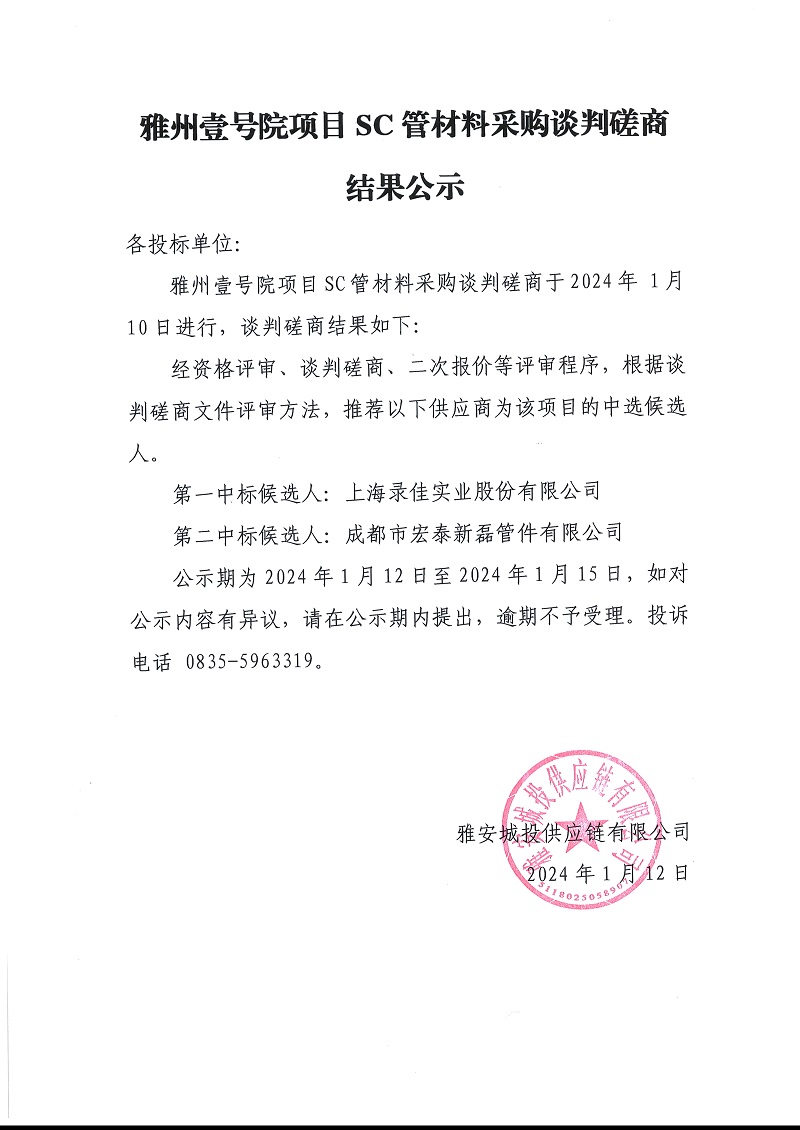 雅州壹號院項(xiàng)目SC管材料采購談判磋商結(jié)果公示
