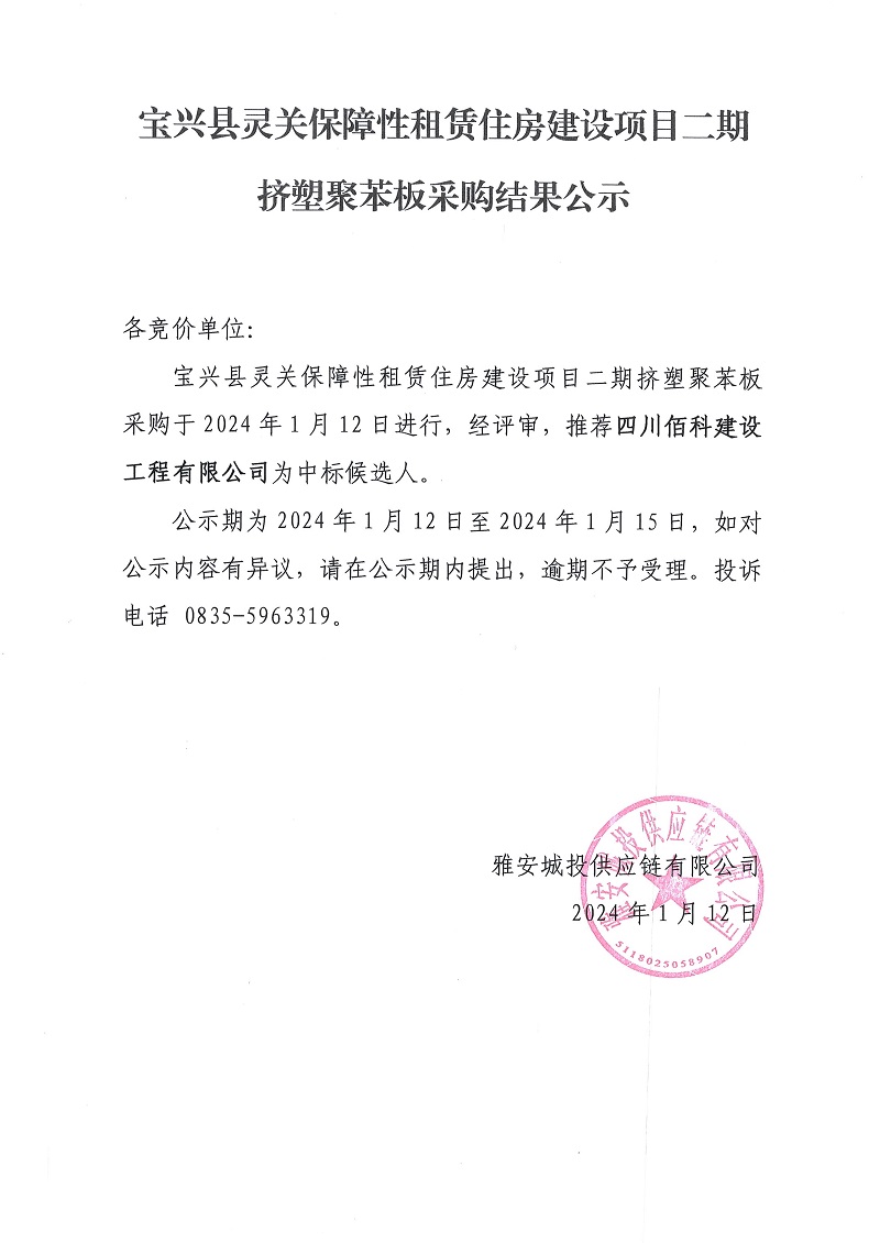寶興縣靈關(guān)保障性租賃住房建設(shè)項(xiàng)目二期技塑聚苯板采購(gòu)結(jié)果公示