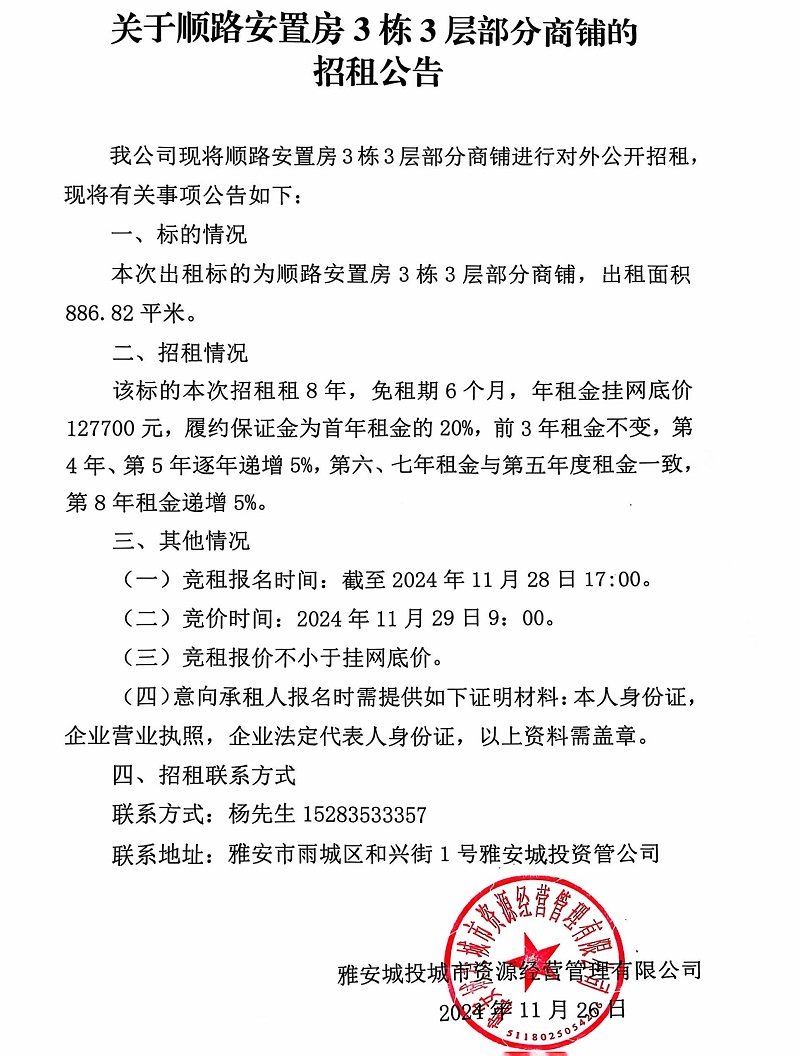 關(guān)于順路安置房3棟3層部分商鋪的招租公告