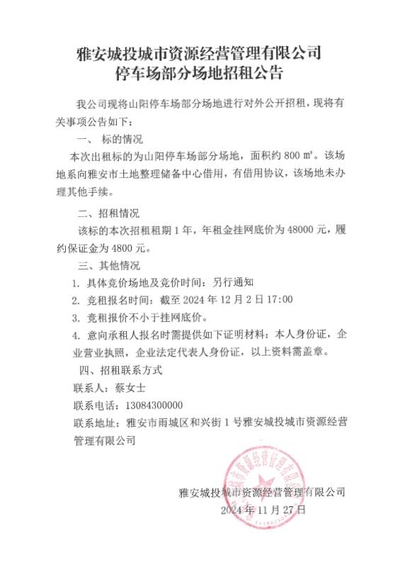 雅安城投城市資源經(jīng)營管理有限公司停車場部分場地招租公告