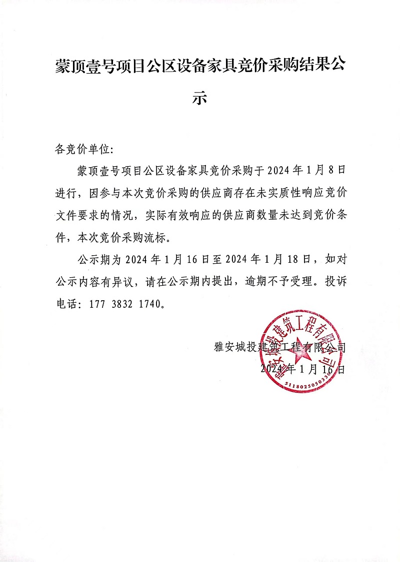 蒙頂壹號項目公區(qū)設備家具競價采購結(jié)果公示
