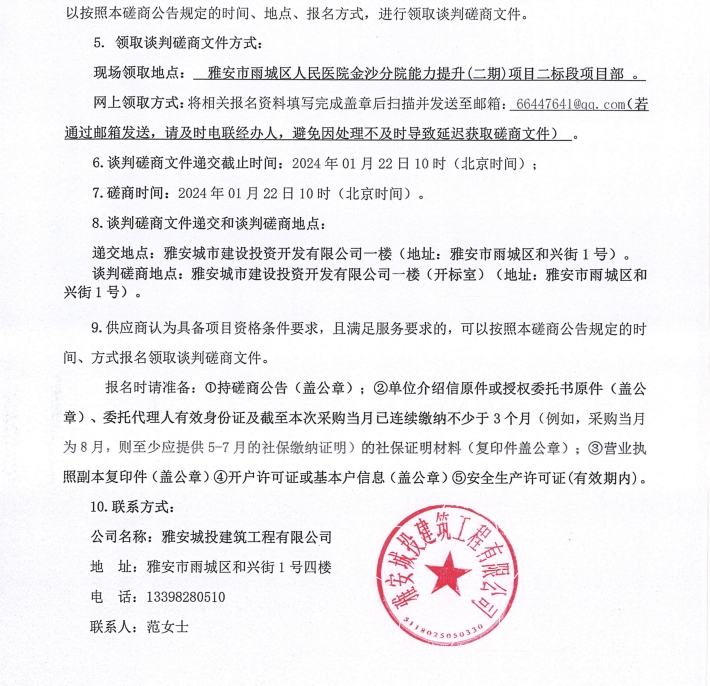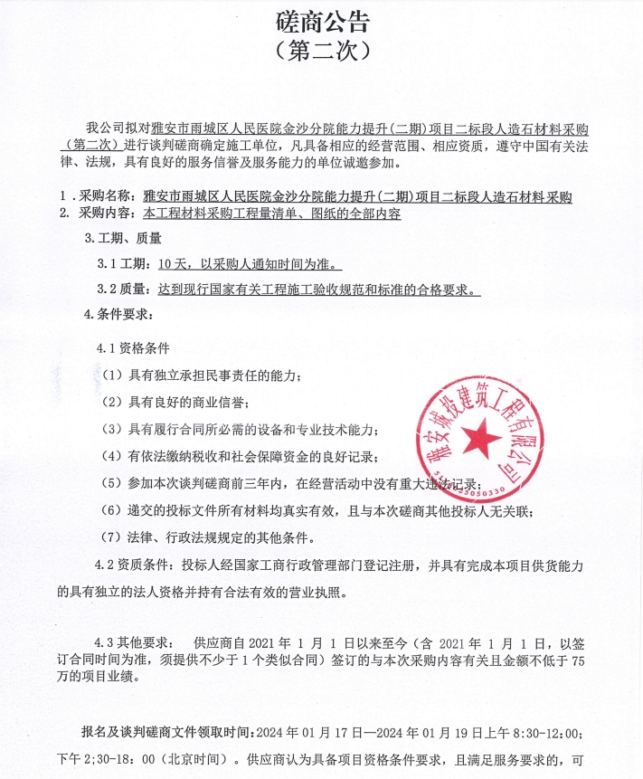 雅安市雨城區(qū)人民醫(yī)院金沙分院能力提升(二期)項(xiàng)目二標(biāo)段人造石材料(第二次)采購談判磋商公告