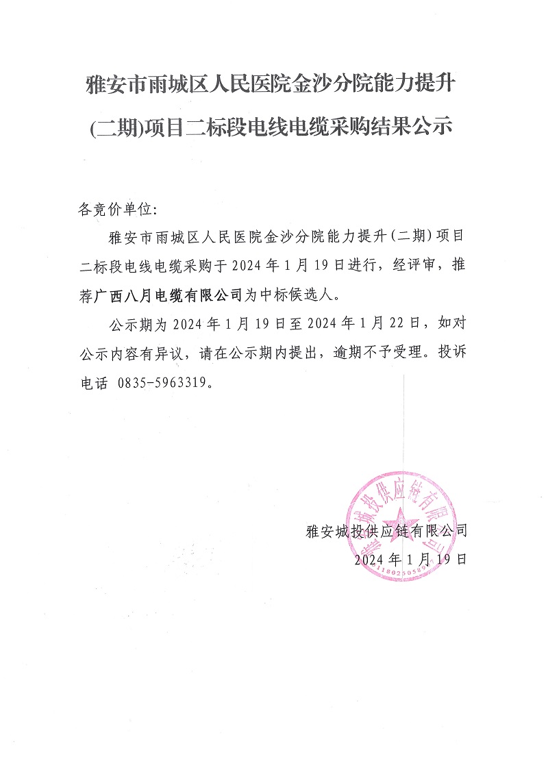 雅安市雨城區(qū)人民醫(yī)院金沙分院能力提升(二期)項(xiàng)目二標(biāo)段電線電纜采購(gòu)結(jié)果公示