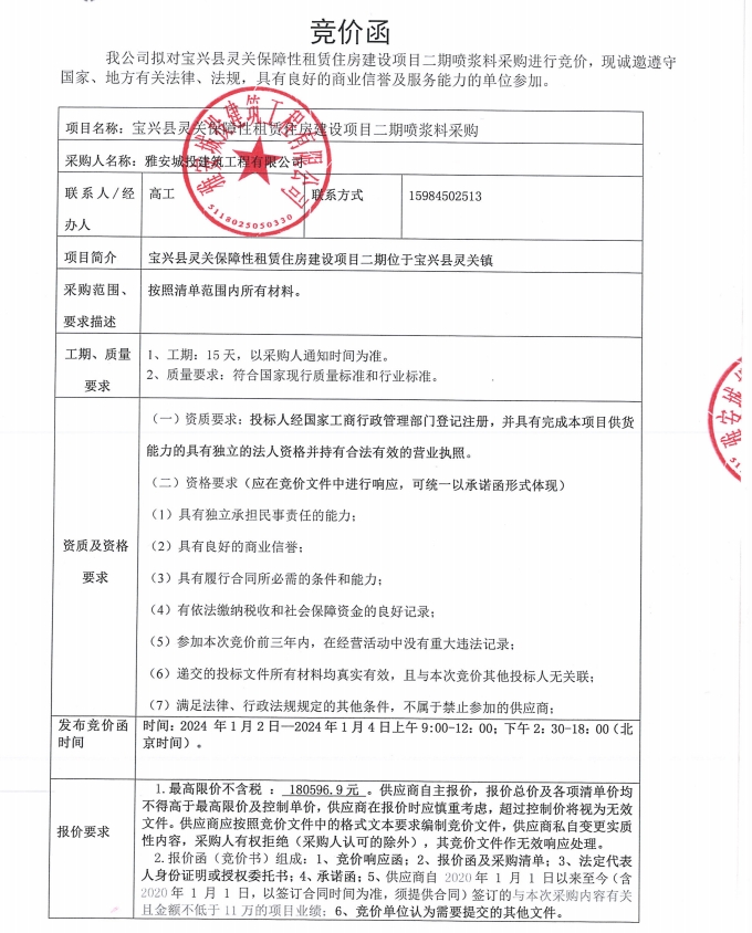 寶興縣靈關(guān)保障性租賃住房建設(shè)項(xiàng)目二期噴漿料采購競價(jià)公告