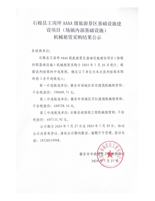 石棉縣王崗坪AAAA級旅游景區(qū)基礎(chǔ)設(shè)施建設(shè)項(xiàng)目(場鎮(zhèn)內(nèi)部基礎(chǔ)設(shè)施)機(jī)械租賃采購結(jié)果公示