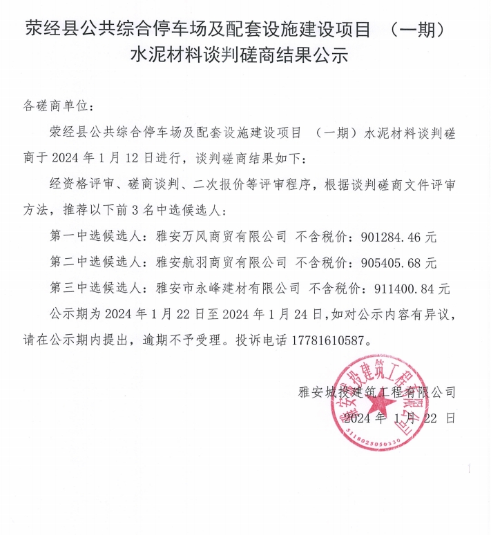 滎經(jīng)縣公共綜合停車場及配套基礎(chǔ)設(shè)施建設(shè)項目(一期)水泥材料談判磋商結(jié)果公示
