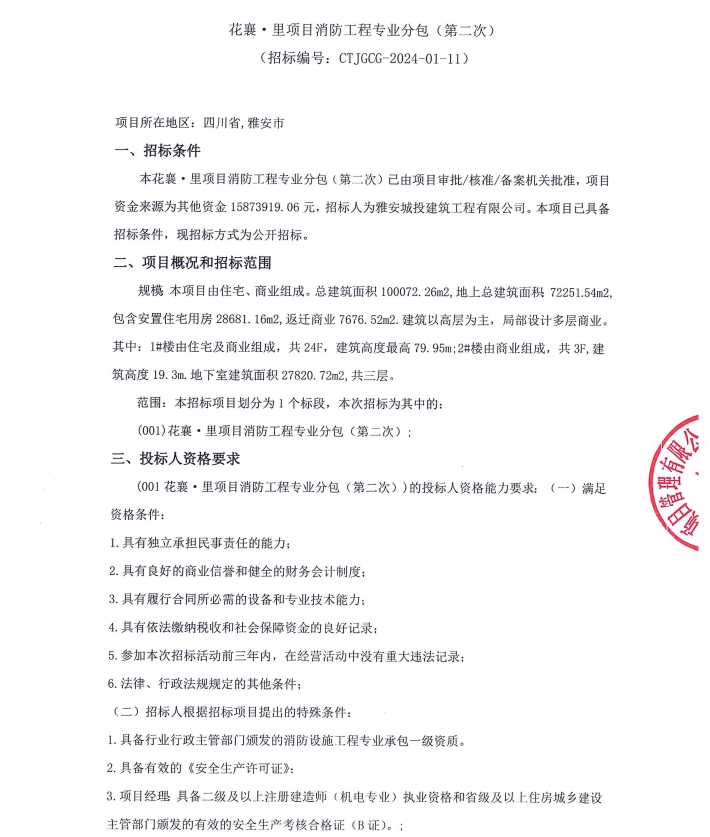 花襄·里項目消防工程專業(yè)分包(第二次)公告