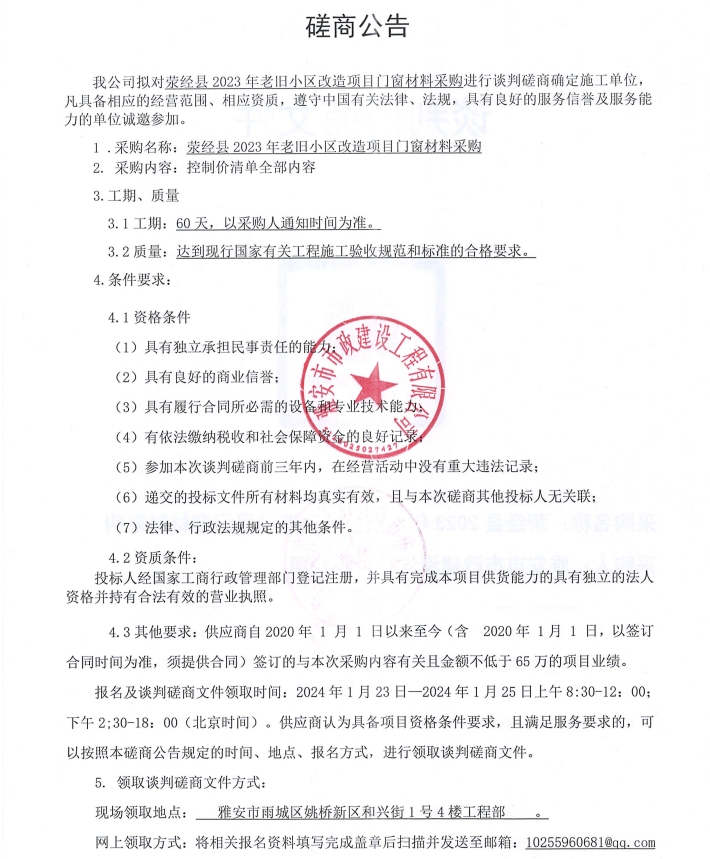 滎經(jīng)縣2023年老舊小區(qū)改造項(xiàng)目門窗材料采購談判磋商公告