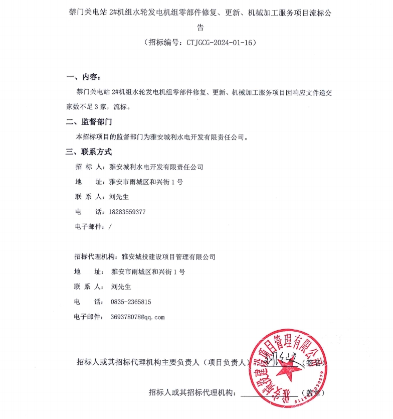 禁門關(guān)電站2#機組水輪發(fā)電機組零部件修復(fù)、更新、機械加工服務(wù)項目流標(biāo)公告