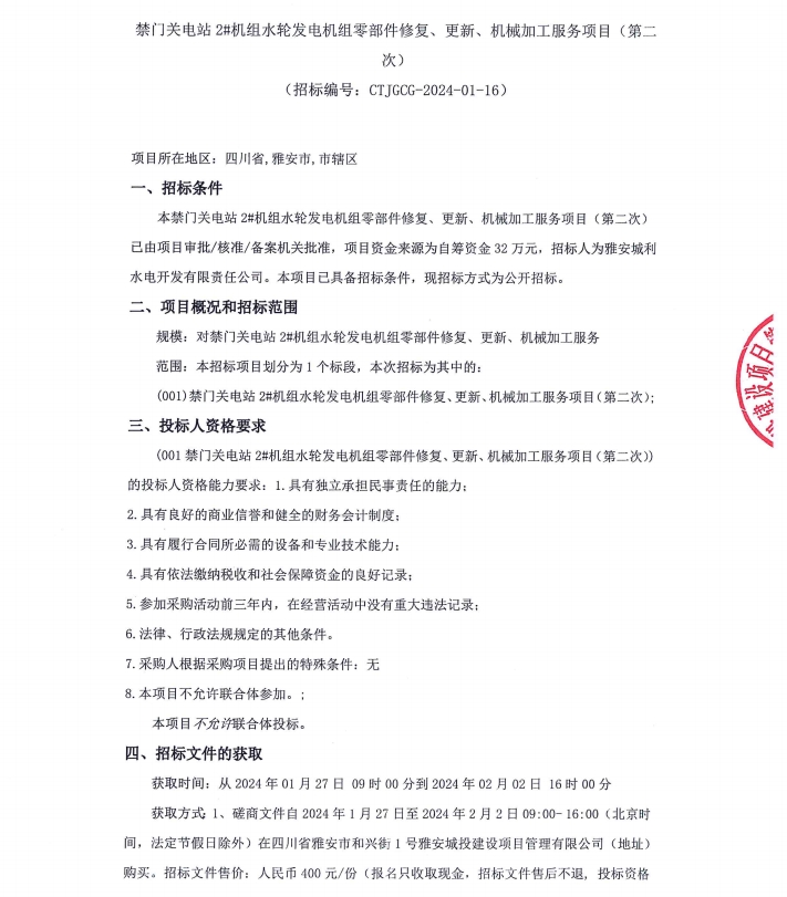禁門關電站2#機組水輪發(fā)電機組零部件修復、更新、機械加工服務項目(第二次)公告