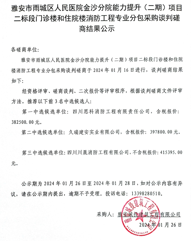 雅安市雨城區(qū)人民醫(yī)院金沙分院能力提升(二期)項目二標(biāo)段門診樓和住院樓消防工程專業(yè)分包采購談判磋商結(jié)果公示