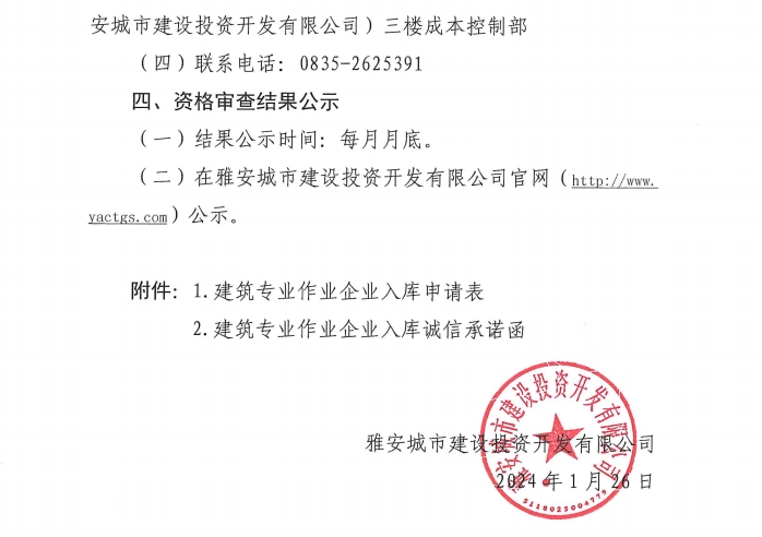 雅安城市建設(shè)投資開發(fā)有限公司關(guān)于建筑專業(yè)作業(yè)企業(yè)入庫的邀請(qǐng)公告