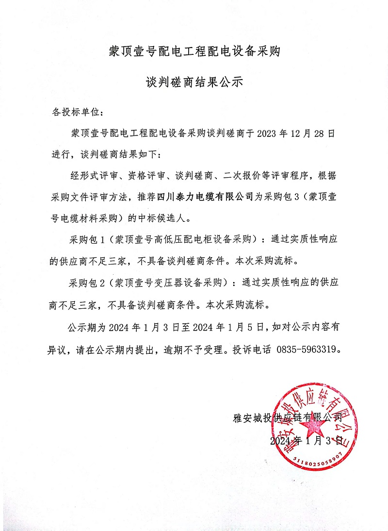 蒙頂壹號(hào)配電工程配電設(shè)備采購(gòu)談判磋商結(jié)果公示