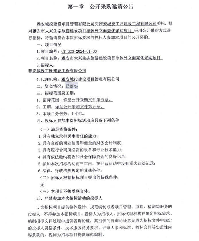 雅安市大興生態(tài)旅游建設項目單體外立面亮化采購項目公開采購邀請公告