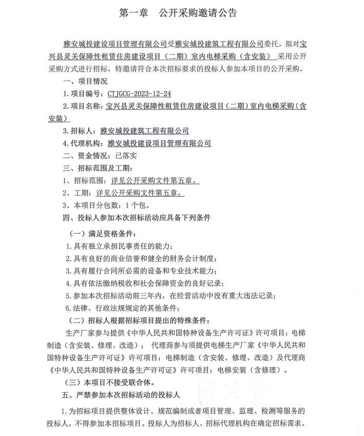 寶興縣靈關(guān)保障性租賃住房建設(shè)項(xiàng)目(二期)室內(nèi)電梯采購(含安裝)公開采購邀請(qǐng)公告