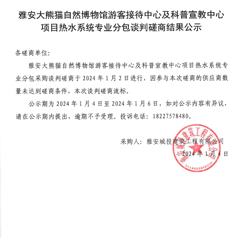 雅安大熊貓自然博物館游客接待中心及科普宣教中心項(xiàng)目熱水系統(tǒng)專(zhuān)業(yè)分包談判磋商結(jié)果公示