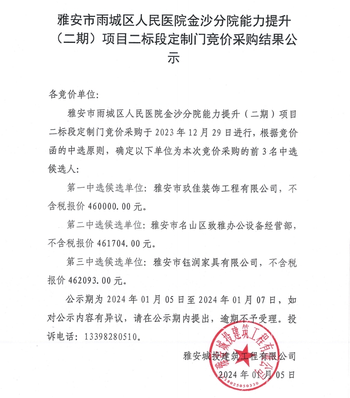 雅安市雨城區(qū)人民醫(yī)院金沙分院能力提升(二期)項(xiàng)目二標(biāo)段定制門競(jìng)價(jià)采購(gòu)結(jié)果公示