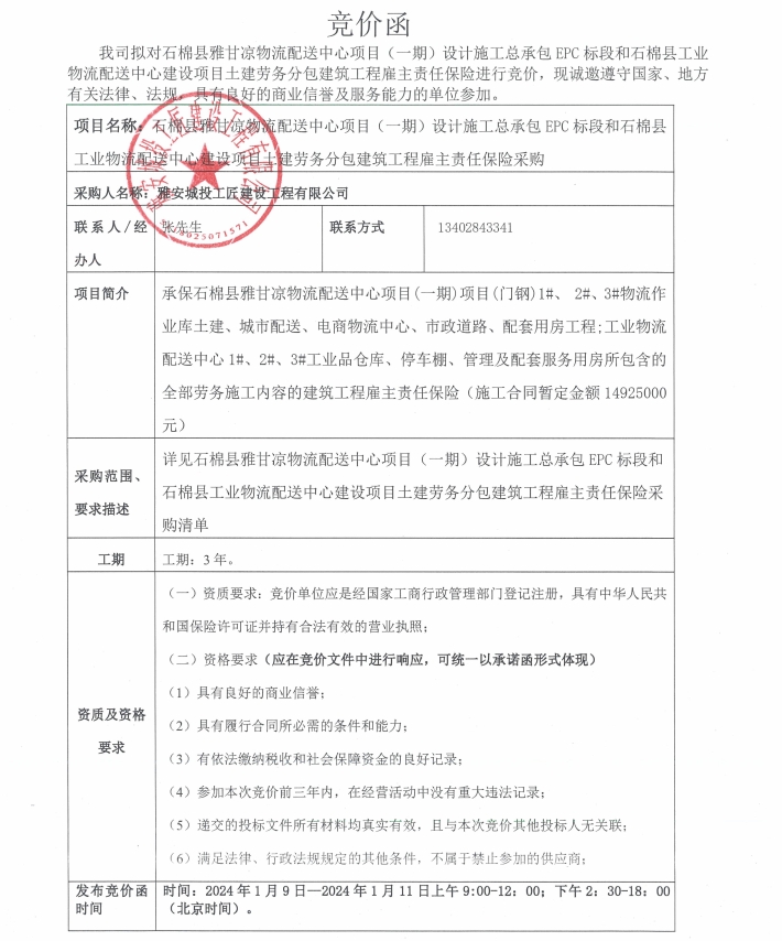 石棉縣雅甘涼物流配送中心項目(一期)設(shè)計施工總承包EPC標(biāo)段和石棉縣工業(yè)物流配送中心建設(shè)項目土建勞務(wù)分包建筑工程雇主責(zé)任保險采購競價公告