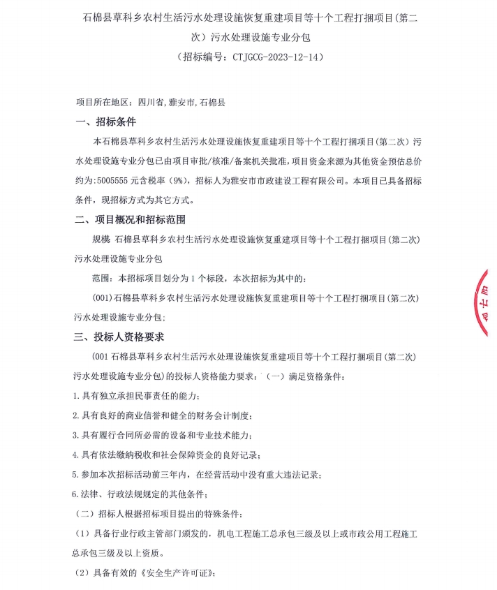 石棉縣草科鄉(xiāng)農(nóng)村生活污水處理設(shè)施恢復(fù)重建項(xiàng)目等十個(gè)工程打捆項(xiàng)目(第二次)污水處理設(shè)施專業(yè)分包采購公告