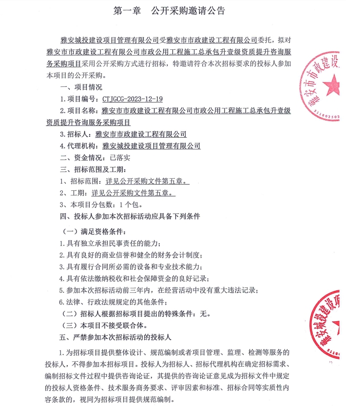雅安市市政建設(shè)工程有限公司市政公用工程施工總承包升壹級(jí)資質(zhì)提升咨詢服務(wù)采購(gòu)項(xiàng)目公開采購(gòu)邀請(qǐng)公告