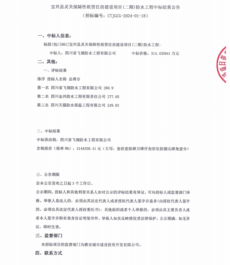 寶興縣靈關保障性租賃住房建設項目(二期)防水工程中標結果公告
