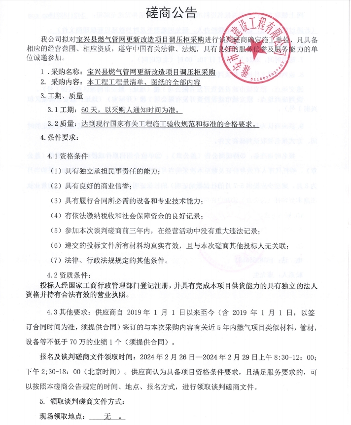 寶興縣燃?xì)夤芫W(wǎng)更新改造項(xiàng)目調(diào)壓柜采購(gòu)談判磋商公告