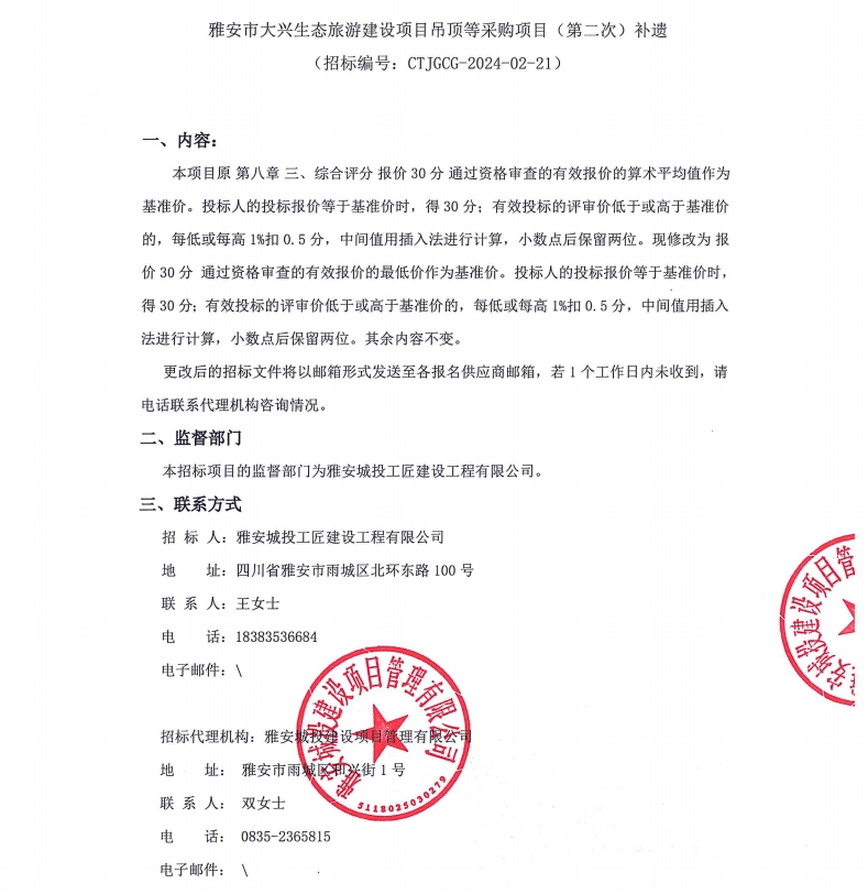 雅安市大興生態(tài)旅游建設(shè)項(xiàng)目吊頂?shù)炔少忢?xiàng)目(第二次)補(bǔ)遺公告